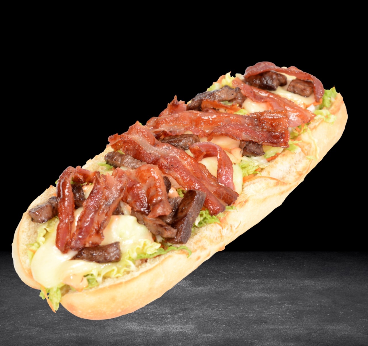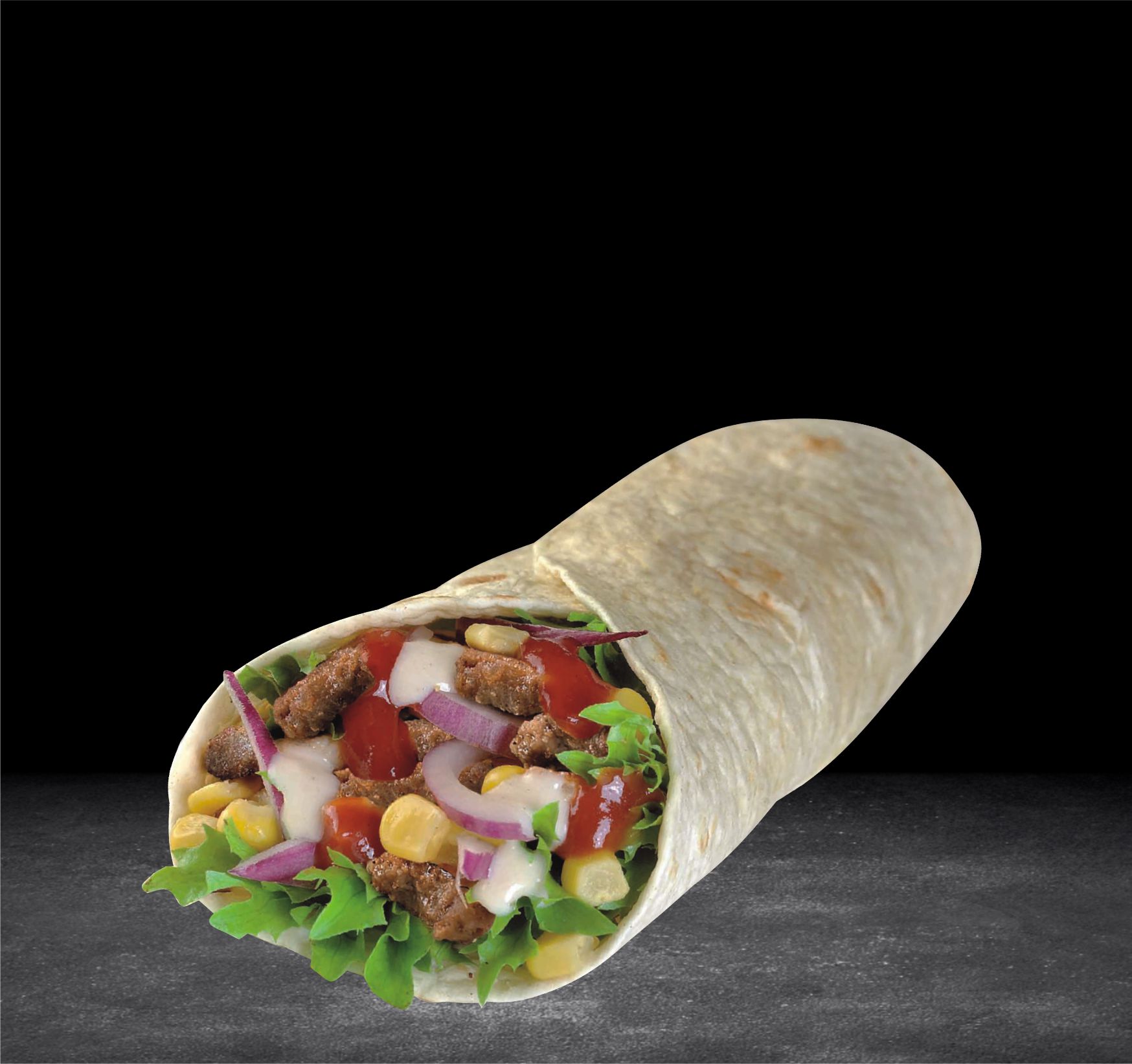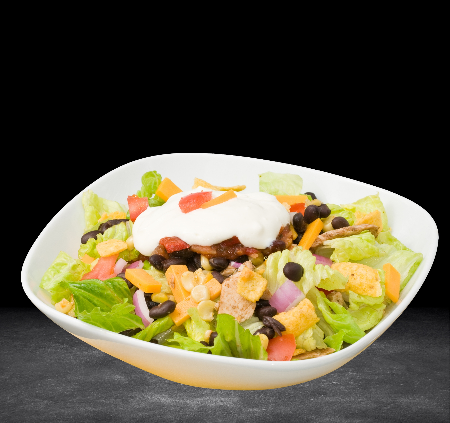 salat, mais,rødløk, tomat, sylteagurk, hvitløksdressing, ost, bacon, spicy buffalosaus