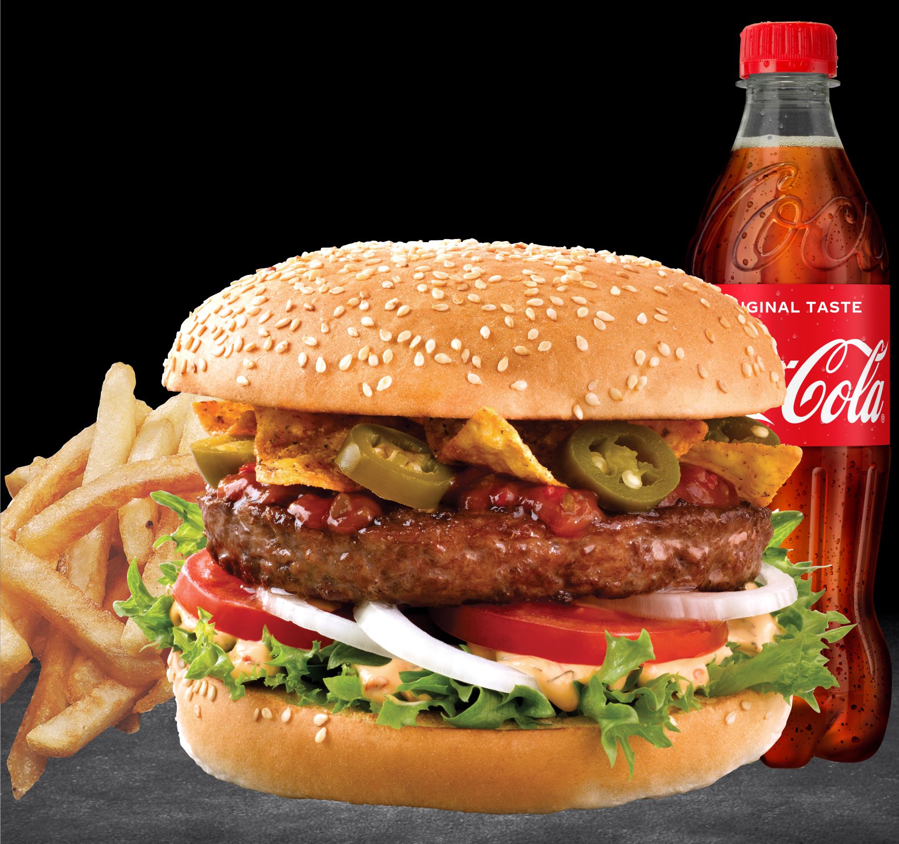 Spicy Buffaloburger meny inkl pommes og 0,5l drikke