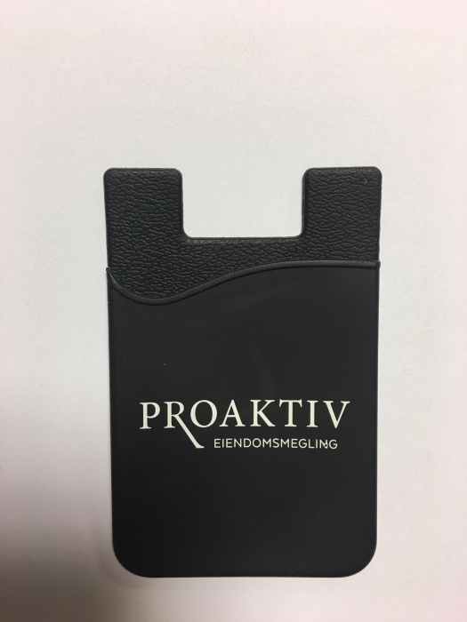 Mobilkortholder som festes bak på mobilen. Sort med hvit Proaktiv Eiendomsmegling logo. Plass til Visa kort mm.